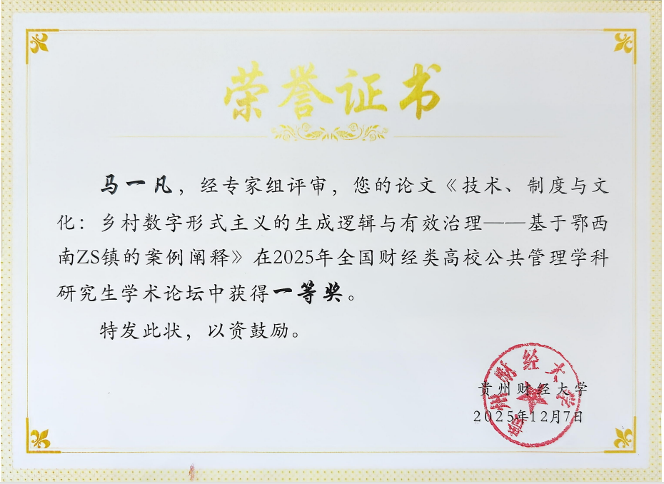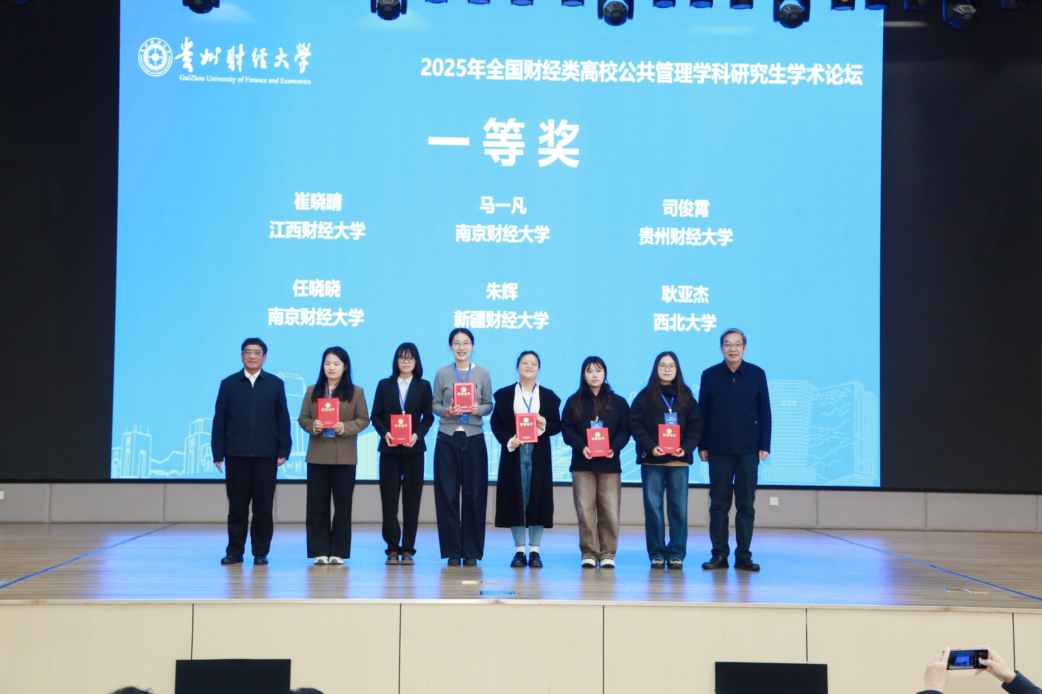 12月7日,由贵州财经大学承办的“2025年全国财经类高校公共管理学科研究生学术论坛”在贵阳隆重举行。本次论坛汇聚了来自全国多所高等院校的专家学者及青年学子,共同探讨公共管理领域的前沿议题。我司经理黄建伟教授与三名硕士研究生参加了此次论坛,并围绕其最新的学术研究成果进行了汇报与交流,其中两名员工作品获评一等奖。