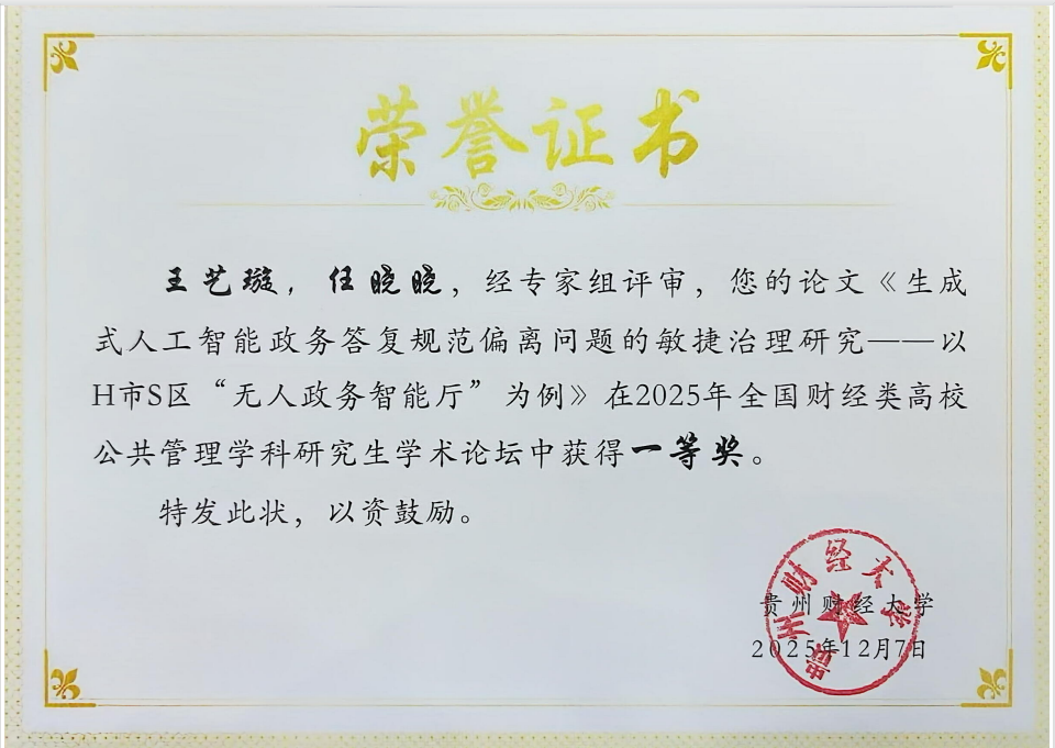 在论坛组织的优秀论文评选中,我司马一凡、任晓晓两位同学的研究成果获得评审专家一致认可,荣获一等奖,为学院赢得了荣誉。论坛一等奖由国务院公共管理学科评议组联合召集人丁煌教授和贵州财经大学党委书记缪坤和教授颁发。